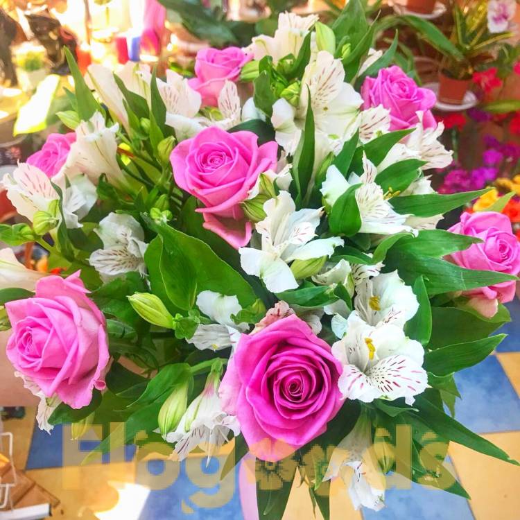 Объёмный букет цветов из альстромерий и роз. Этот букет является хорошим подарком для девушек, женщин и семьи. Обычно его дарят на такие праздники как День Рождения.